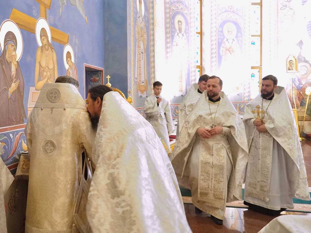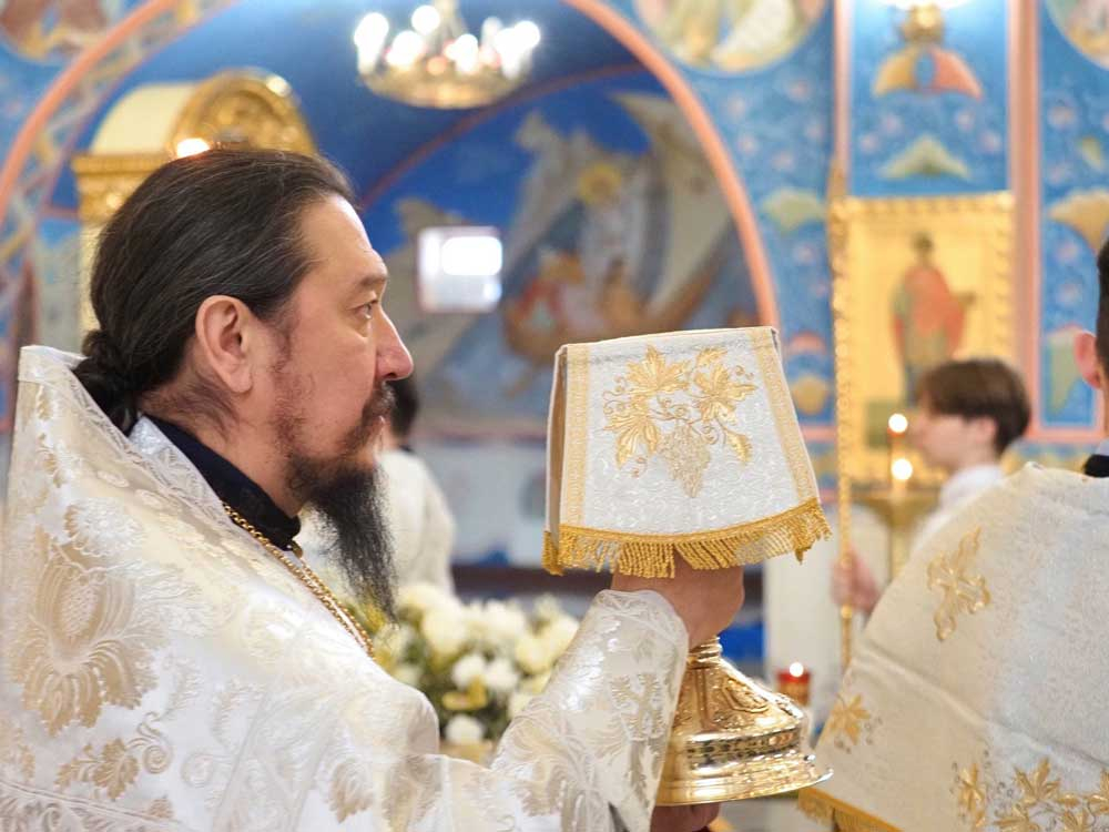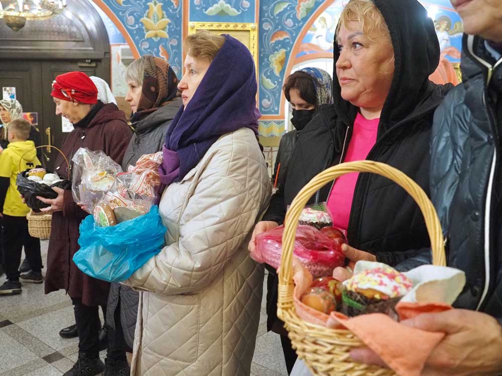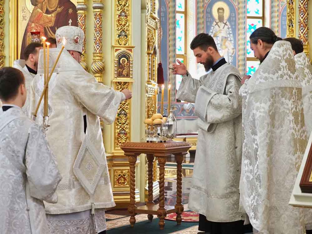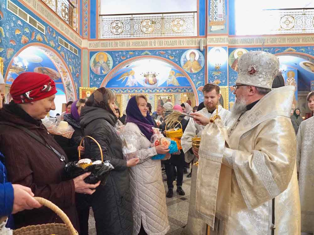 По отпусте иерарх совершил освящение хлеба и вина и поздравил паству с Великой субботой.