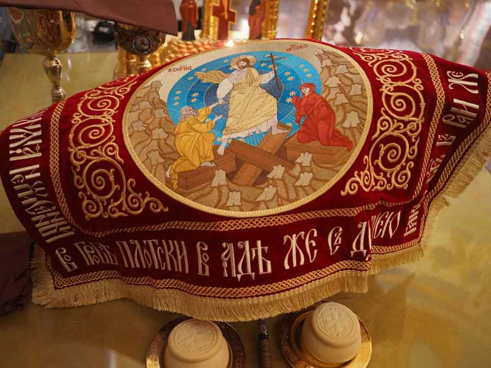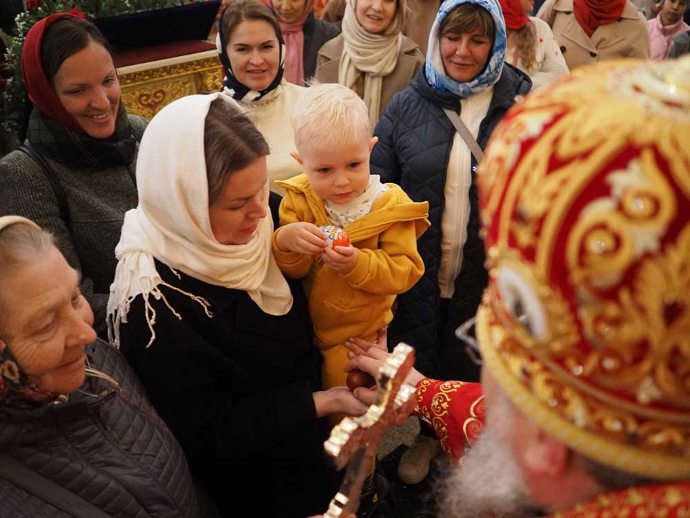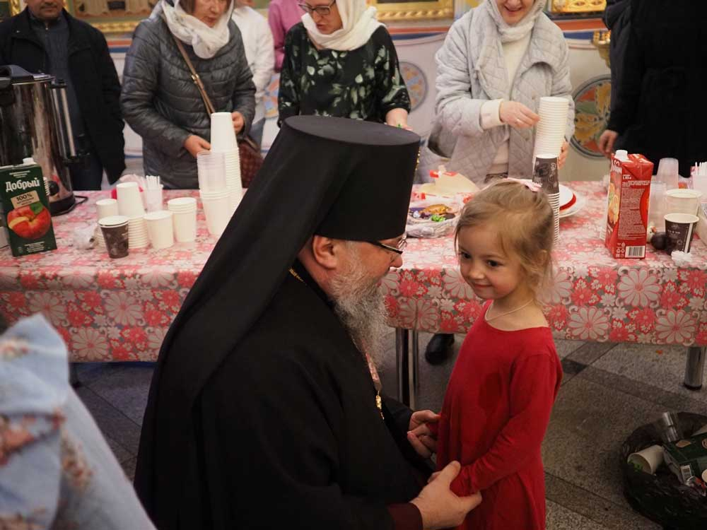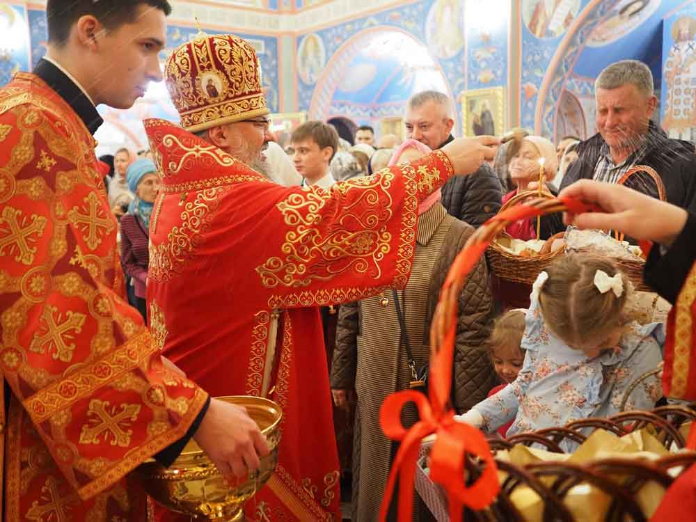 По заамвонной молитве архипастырь освятил артос и пасхальную снедь, принесенную верующими и поздравил прихожан с праздником Светлого Христова Воскресения.