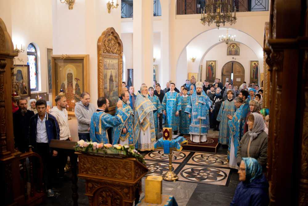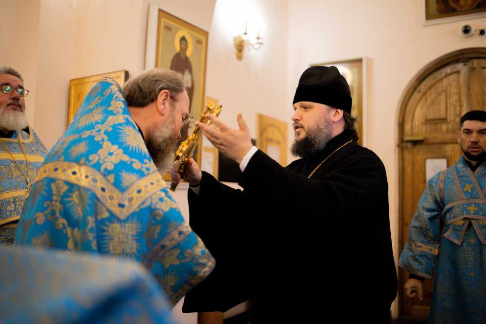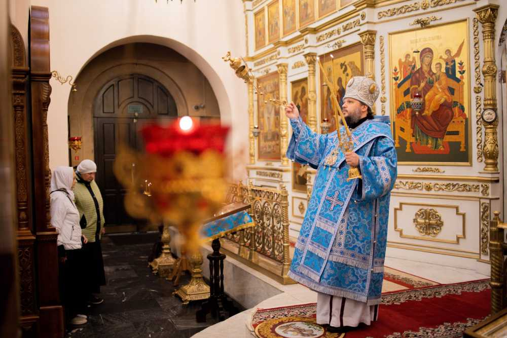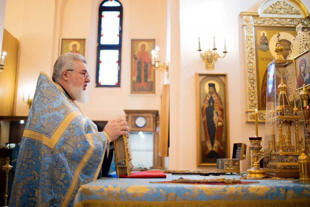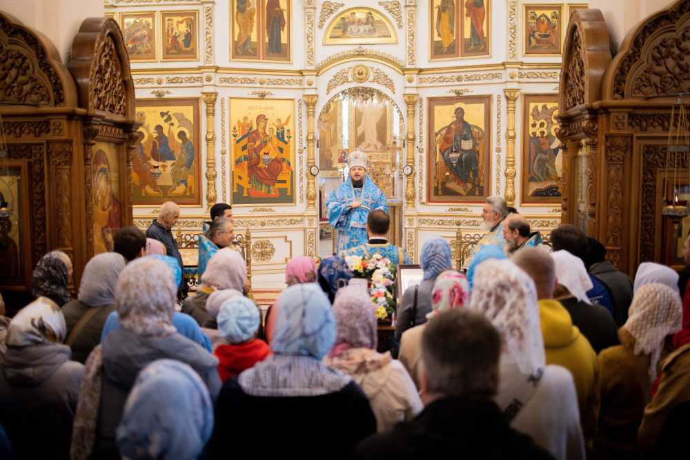 По окончании богослужения епископ Николай посетил нижний храм Воскресения Словущего, где помолился перед иконами, расстрелянными злоумышленником во время нападения на собор в 2014 году.