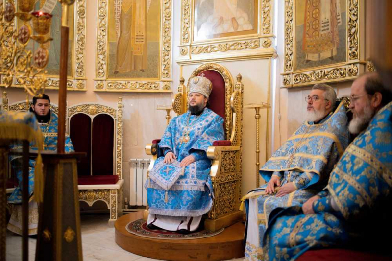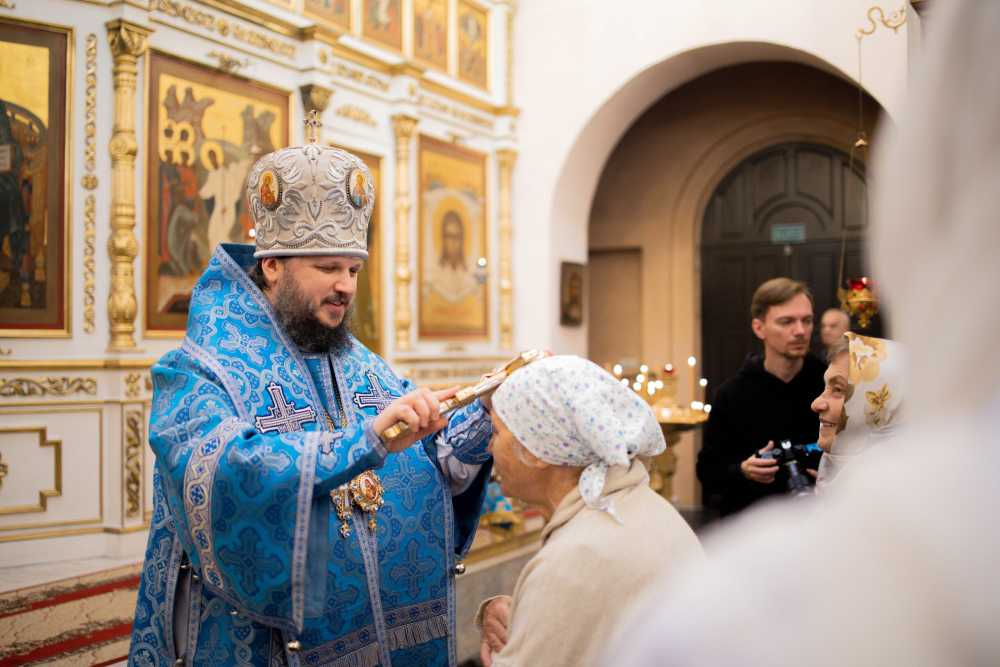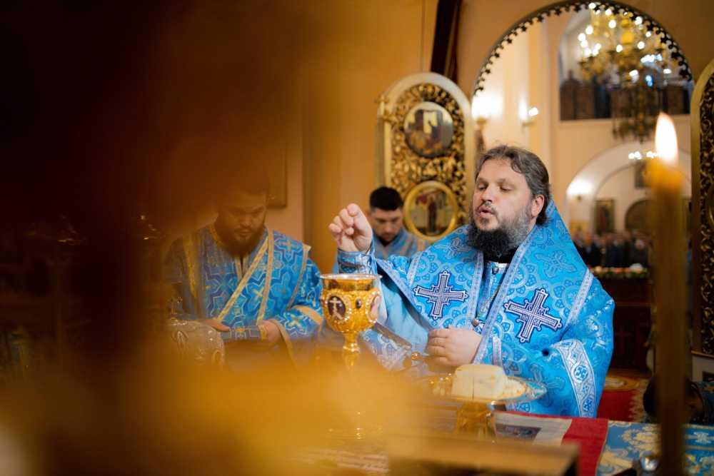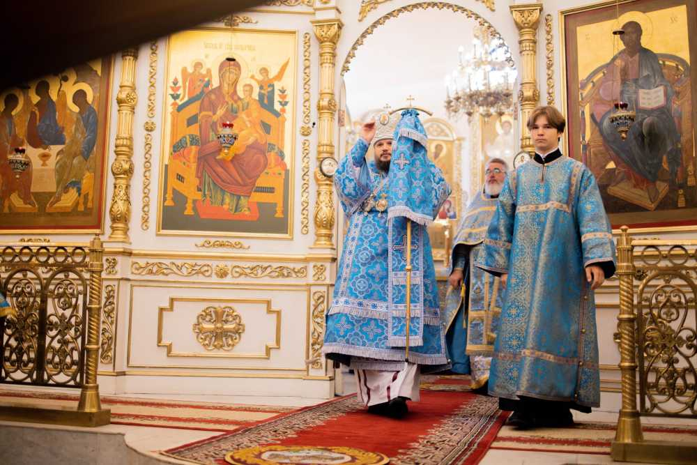 Его Преосвященству сослужили секретарь епархии, настоятель собора иеромонах Аполлинарий (Обухов), ключарь собора иерей Владислав Ивлютин, соборное духовенство.