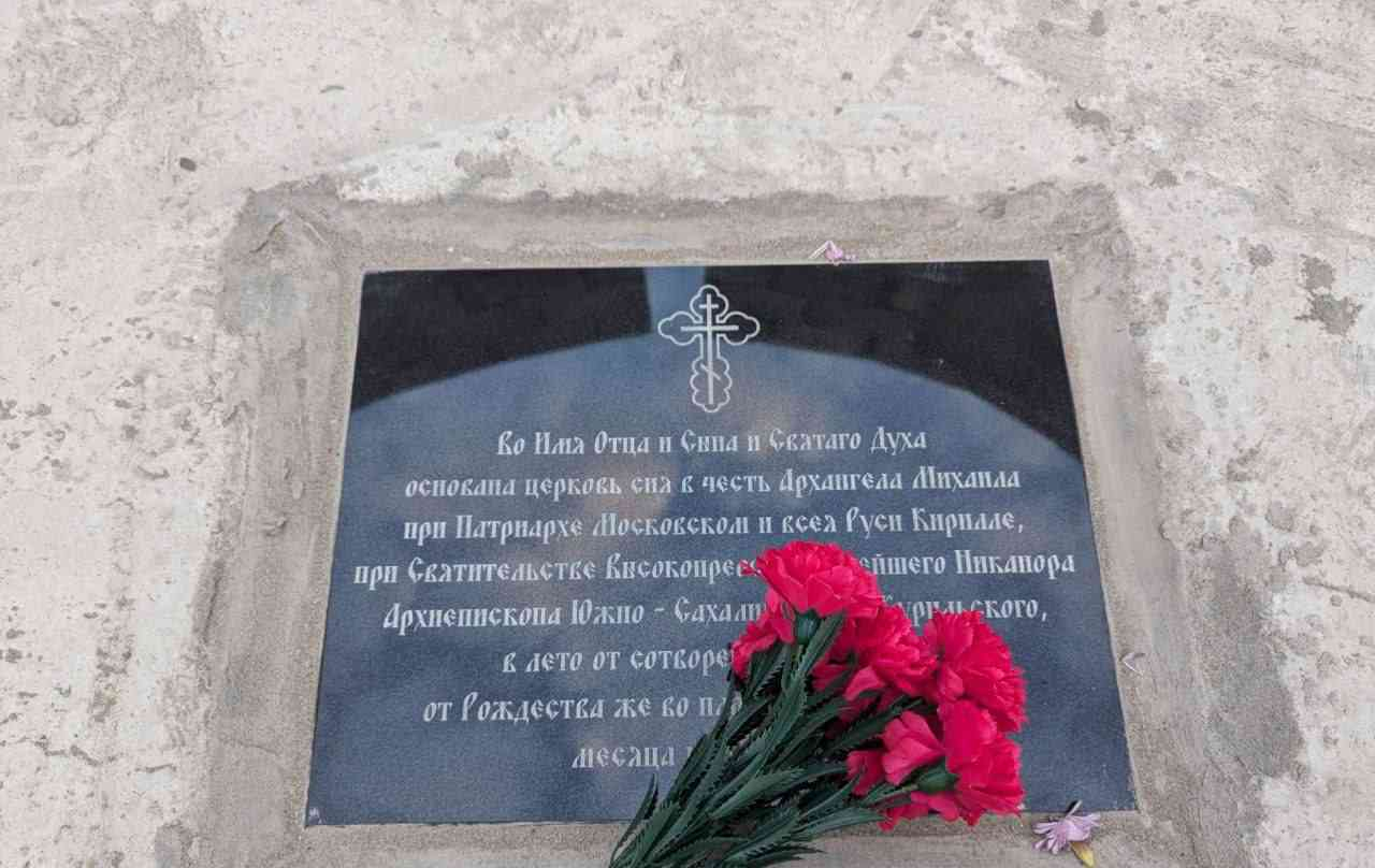 На плите высечена надпись, гласящая, что церковь в честь Архангела Михаила основана при Патриархе Московском и всея Руси Кирилле, при святительстве Высокопреосвященнейшего Никанора, архиепископа Южно-Сахалинского и Курильского, в лето от сотворения мира 7533, от Рождества же во плоти Бога Слова 2024.