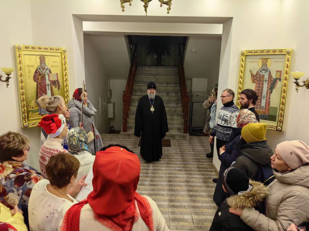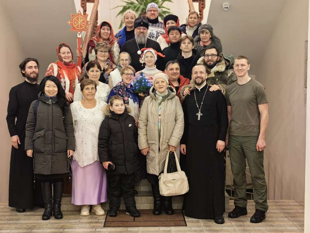 В праздник Рождества Христова священнослужители, прихожане и участники народного хора кафедрального собора Рождества Христова прибыли в епархиальное управление поздравить архиепископа Южно-Сахалинского и Курильского Никанора.