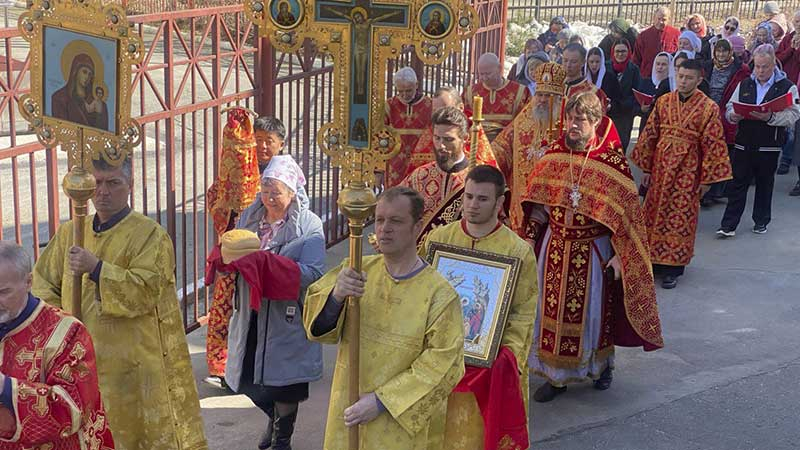 В завершение Литургии иерарх совершил пасхальный крестный ход вокруг храма и поздравил присутствующих на богослужении с праздником Светлого Христова Воскресения.