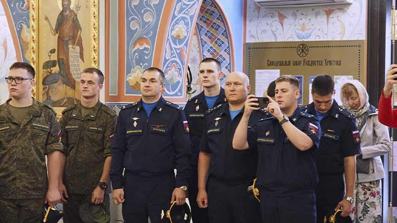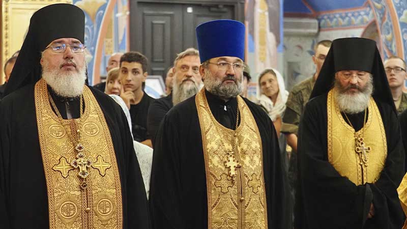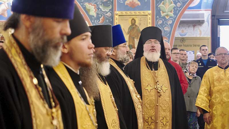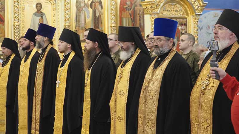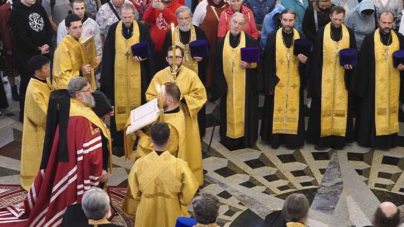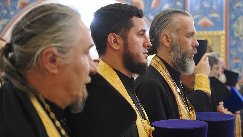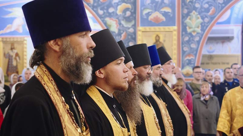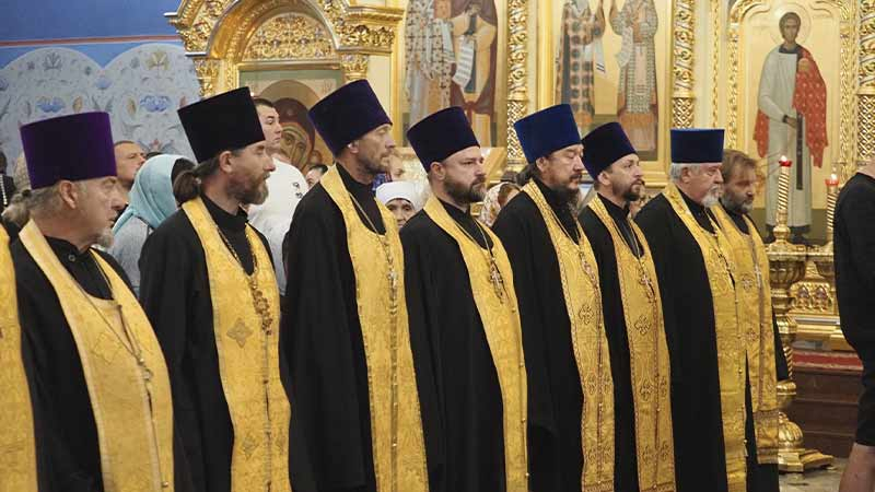 Его Высокопреосвященству сослужили секретарь епархии, настоятель Воскресенского собора г. Южно-Сахалинска иеромонах Аполлинарий (Обухов), благочинный Южно-Сахалинского городского благочиния, настоятель Никольского храма г. Южно-Сахалинска протоиерей Павел Алексеев, настоятель храма свв. новомучеников и исповедников Российских в Бутово протоиерей Кирилл Каледа (Московская городская епархия), настоятель Патриаршего подворья благоверного великого князя Александра Невского с. Троицкое протоиерей Сергий Мощенко, благочинный Долинского благочиния, настоятель Успенского храма г. Долинска протоиерей Вячеслав Каличава, ключарь кафедрального собора иерей Александр Брагин, заведующий канцелярией Южно-Сахалинского епархиального управления иеромонах Лавр (Немодин), настоятели и клирики храмов городского и окружного Южно-Сахалинских благочиний.