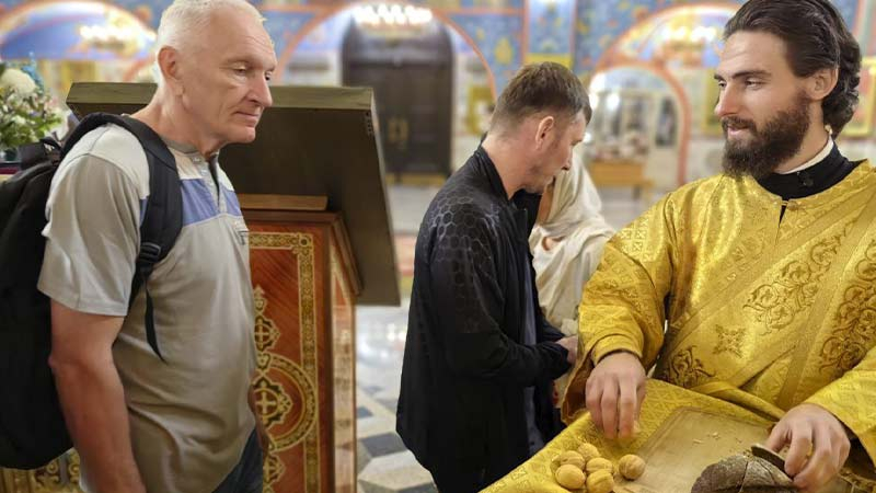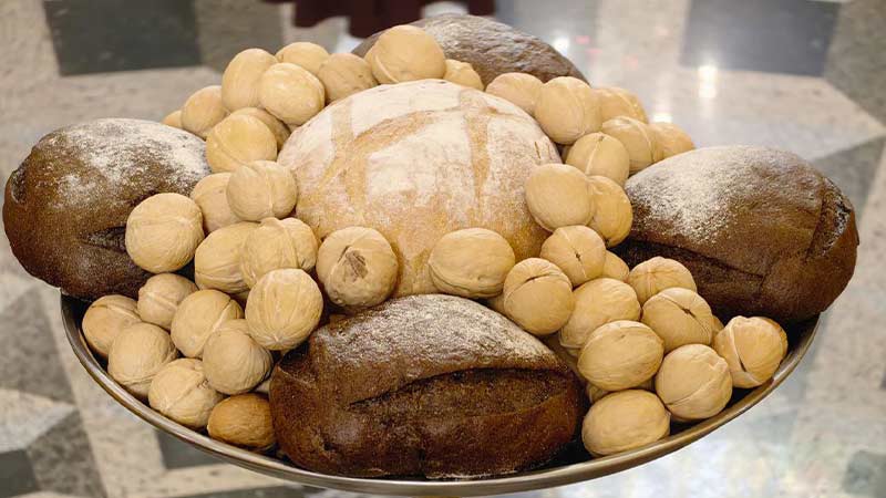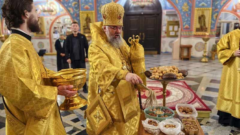 По традиции праздника архипастырь совершил освящение орехов и хлебов.