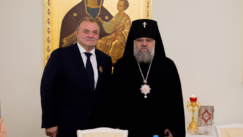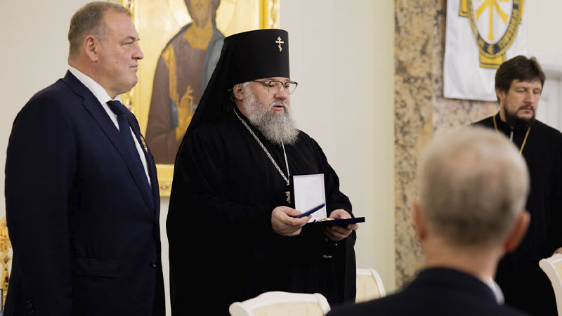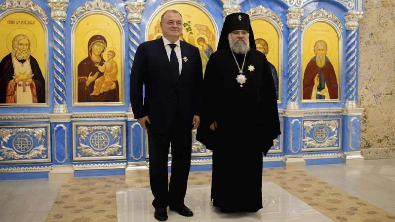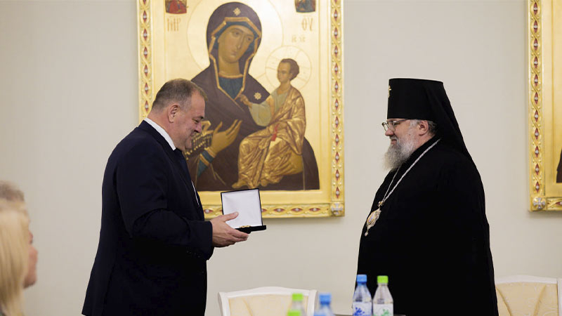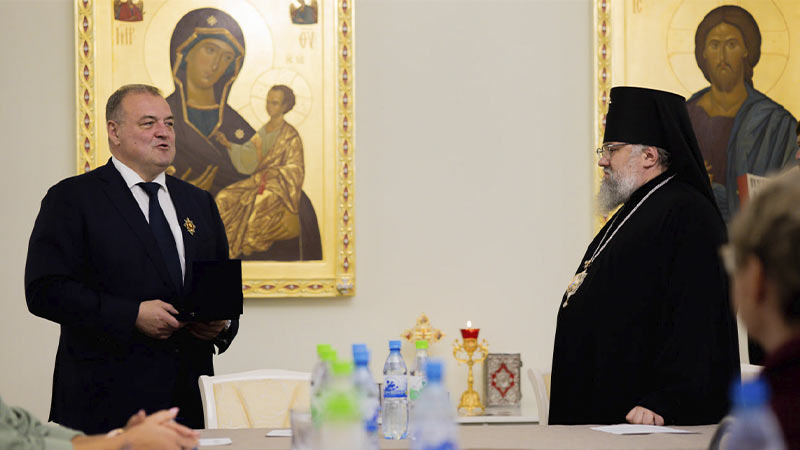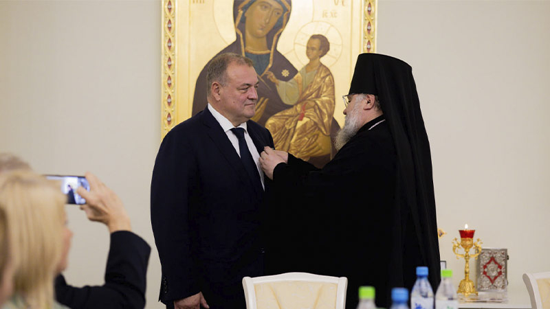 Далее архиепископ Никанор вручил знак и удостоверение действительного члена Императорского Православного Палестинского Общества иеромонаху Аполлинарию (Обухову), руководителю Административного секретариата Южно-Сахалинской и Курильской епархии, настоятелю Воскресенского собора г. Южно-Сахалинска.