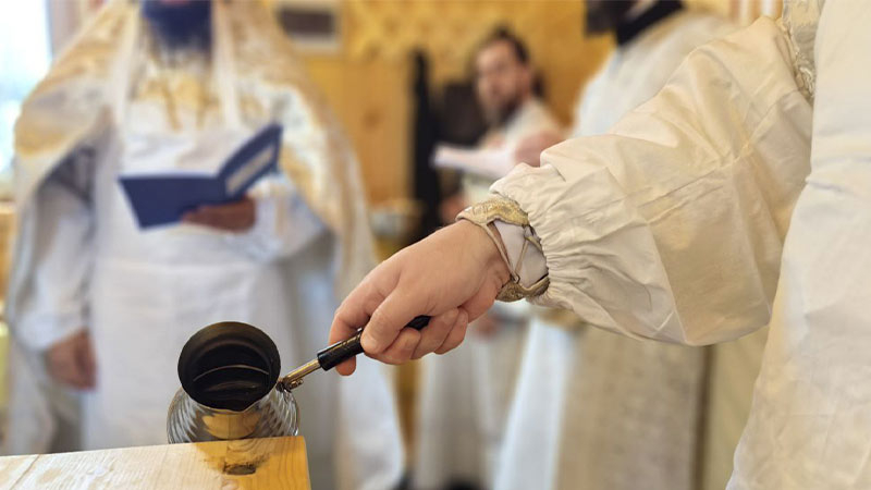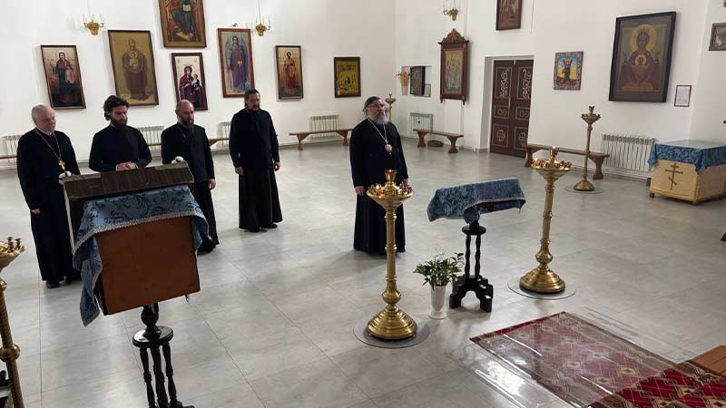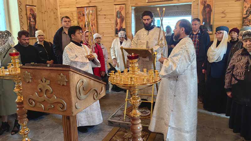 Его Высокопреосященству сослужили благочинный Холмского округа, настоятель храма протоиерей Виктор Крылов, настоятель Лукинского храма в г. Южно-Сахалинске протоиерей Андрей Чугунов, настоятель храма иконы «Призри на смирение» г. Невельска протоиерей Константин Гераськов, клирик Никольского храма г. Холмска иерей Димитрий Кондарацков. Диаконский чин совершил клирик Христо-Рождественского кафедрального собора диакон Александр Скородинский.