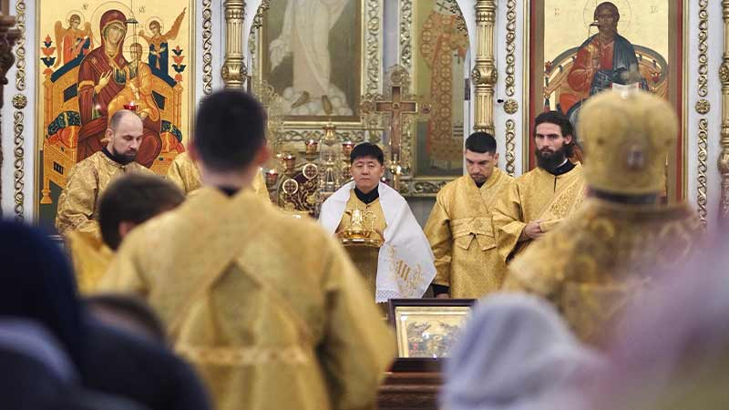 Его Высокопреосвященству сослужили секретарь епархии, настоятель собора иеромонах Аполлинарий (Обухов), заведующий канцелярией Южно-Сахалинского епархиального управления иеромонах Лавр (Немодин), штатное духовенство.