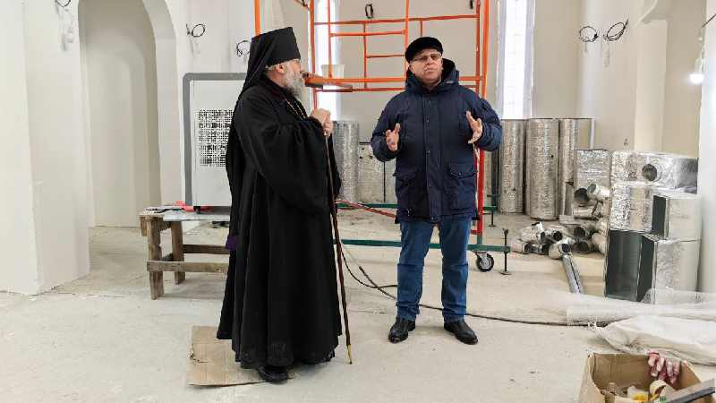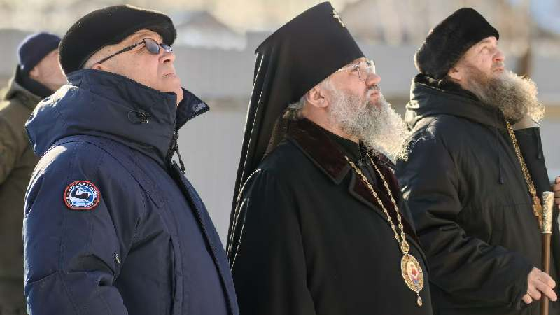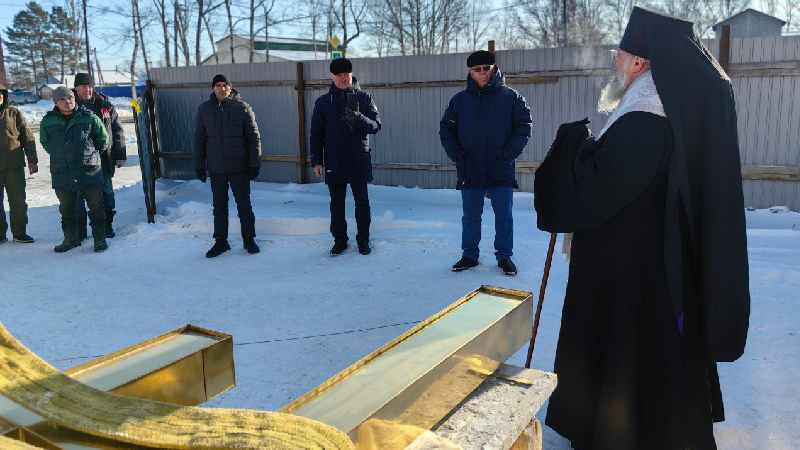 За богослужением присутствовали настоятель Сретенского храма пгт. Смирных игумен Петр Кривцов и подрядчик строительства Марин Викол.
