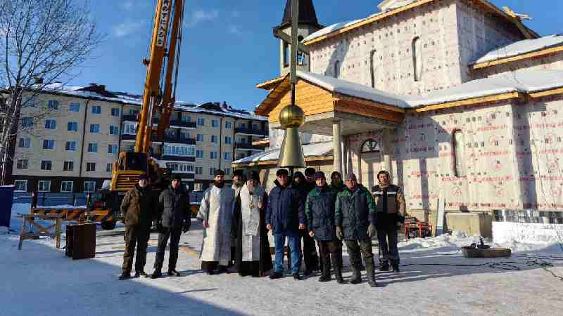Его Высокопреосвященство совершил освящение крестов, куполов и колоколов для возводимого каменного храма в честь великомученика Георгия Победоносца пгт. Смирных.