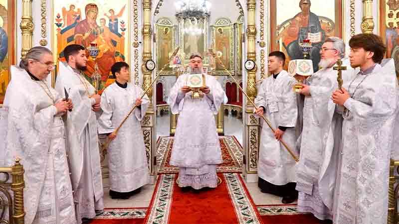 Иерарху сослужили настоятель Лукинского храма г. Южно-Сахалинска протоиерей Андрей Чугунов, ключарь собора иерей Александр Брагин и соборное духовенство.