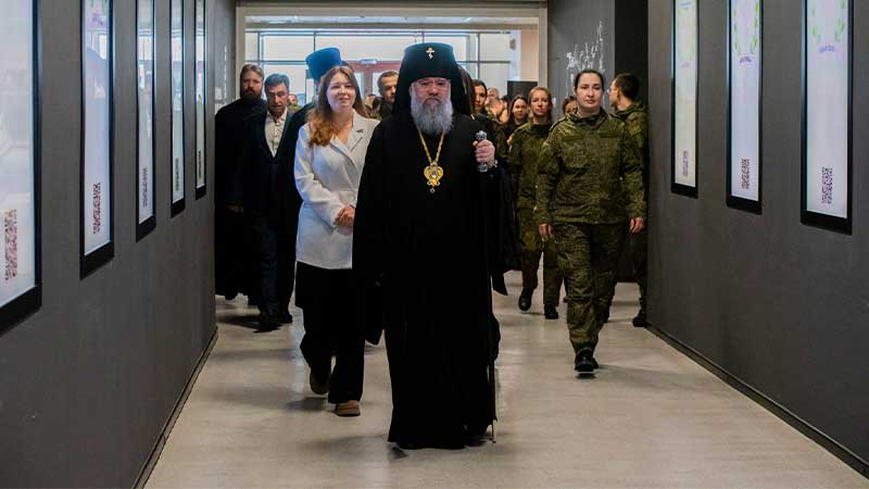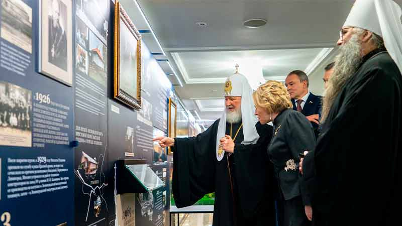 На втором этаже здания Совета Федерации Святейший Владыка осмотрел выставку «Люди Церкви: история одного рода», приуроченную к 80-летию Его Святейшества, и выставку проекта «Возвращение восстановленных икон Донбасса». Проект организован Советом Федерации совместно с Владимирским государственным университетом имени А.Г. и Н.Г. Столетовых. На выставке представлены восстановленные иконы из Петропавловского кафедрального собора г. Луганска. В проекте участвуют студенты кафедры дизайна, изобразительного искусства и реставрации ВлГУ из Донецкой и Луганской Народных Республик, Пермского края, Архангельской, Владимирской, Нижегородской, Ивановской областей.