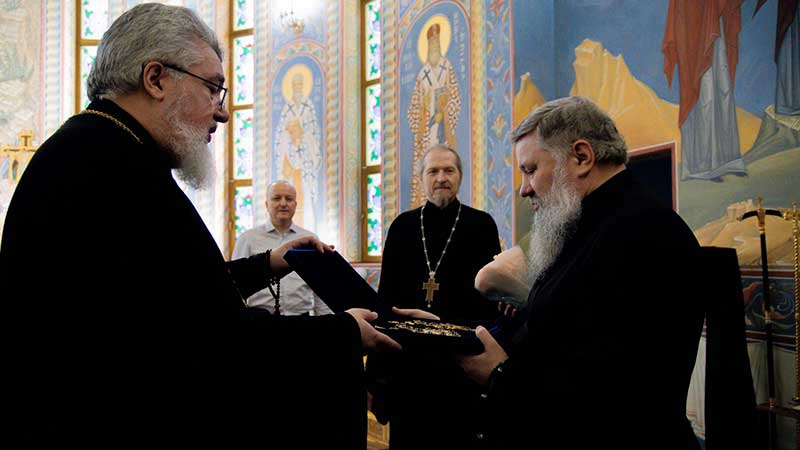 От лица всего духовенства и мирян епархии архиерею были преподнесены наперсный крест и панагия, а также букет белых роз.
