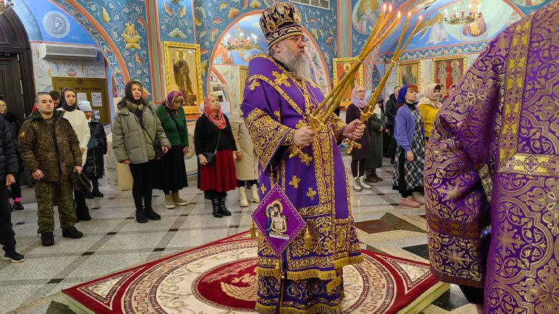 По окончании Литургии Преосвященный владыка совершил чин Торжества Православия – торжественный молебен утверждению неискаженного христианского учения над ересями и расколами, во время которого была провозглашена «Вечная память» защитникам Православной веры, а также многолетие Святейшему Патриарху Московскому и всея Руси Кириллу, Предстоятелям Поместных Православных Церквей, архипастырям, пастырям, властям, воинству и всем православным христианам право содержащим спасительную веру и повинующимся Христовой Церкви.