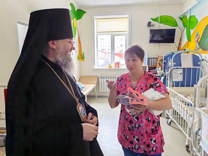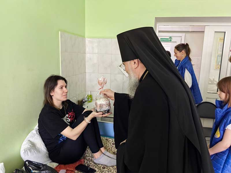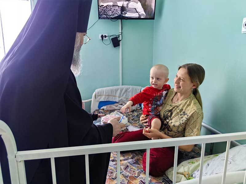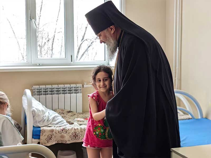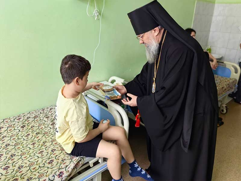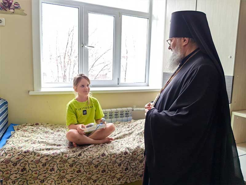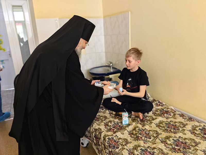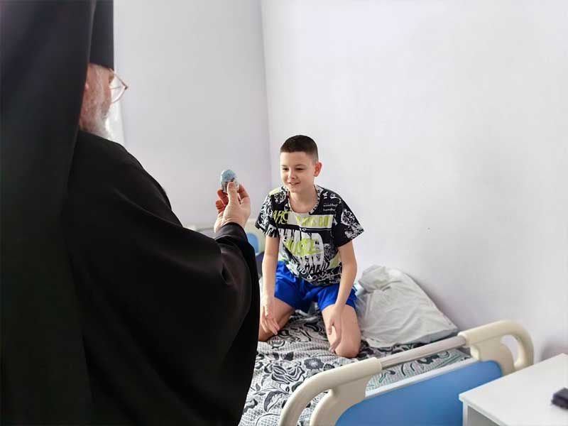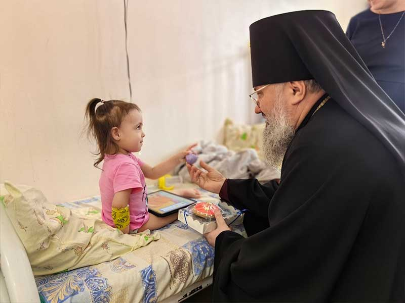 Его Высокопреосвященство поздравил маленьких пациентов, их родителей и медицинский персонал с праздником Светлого Христова Воскресения, вручив ребятишкам куличи и сладкие подарки.