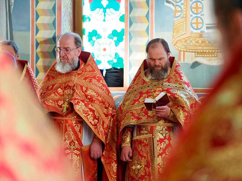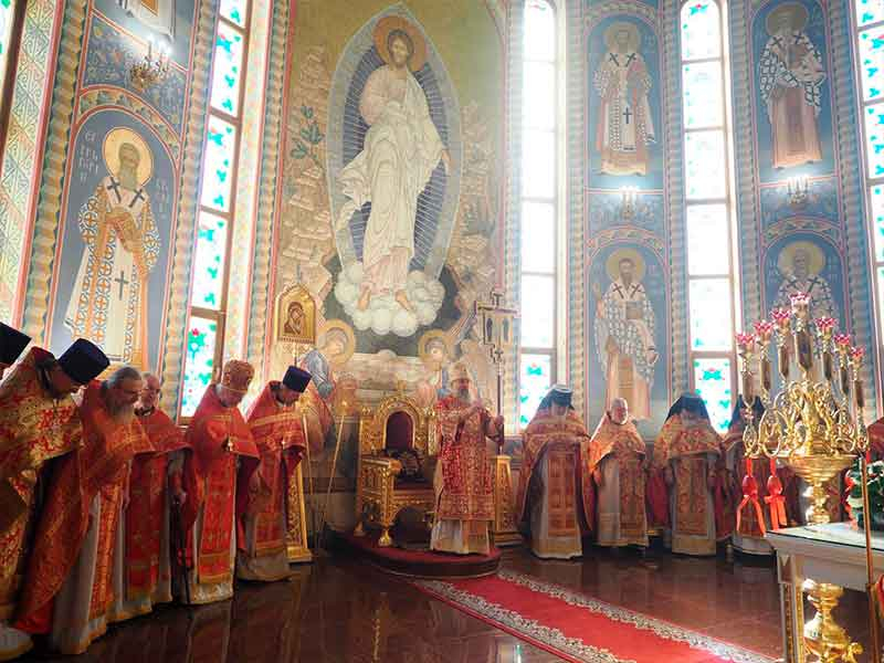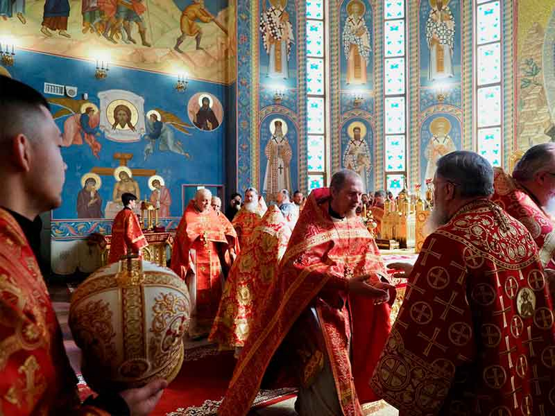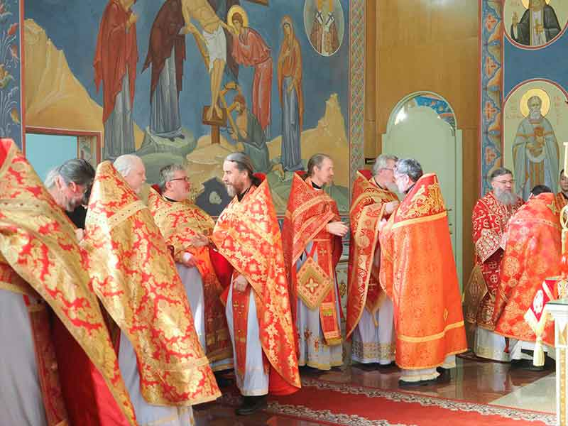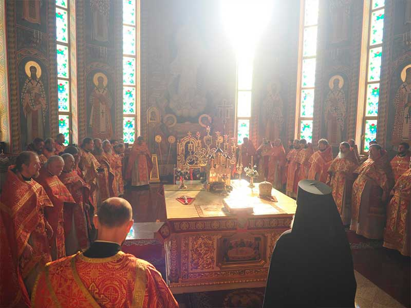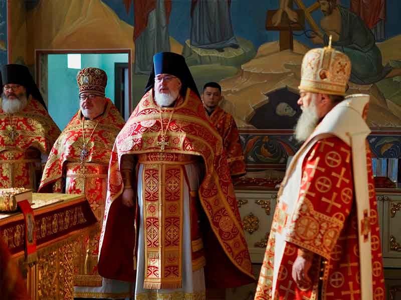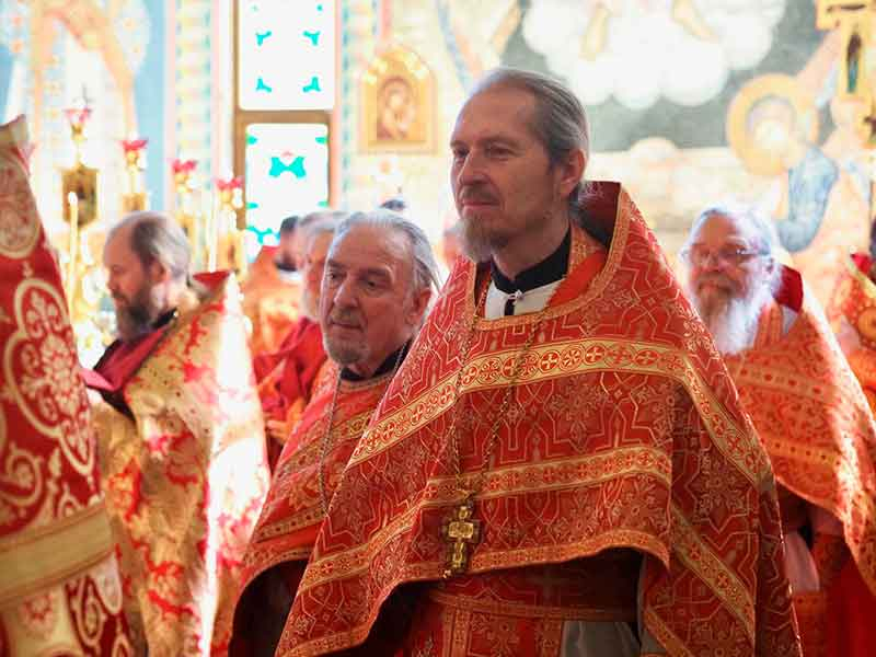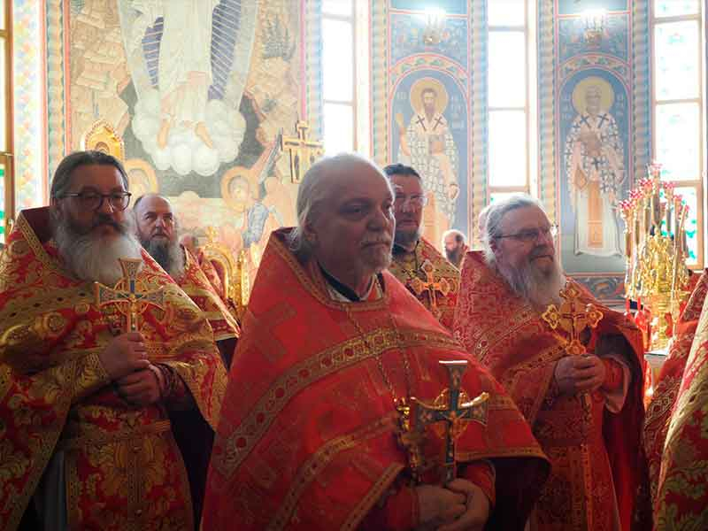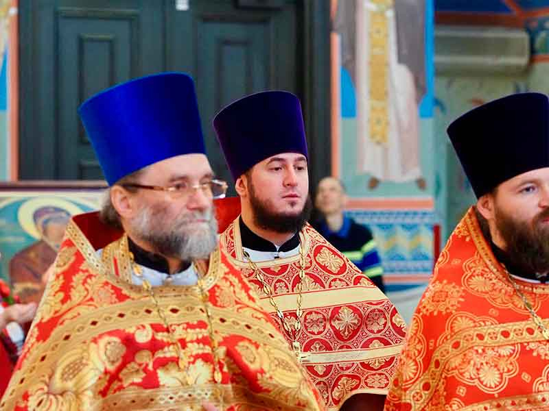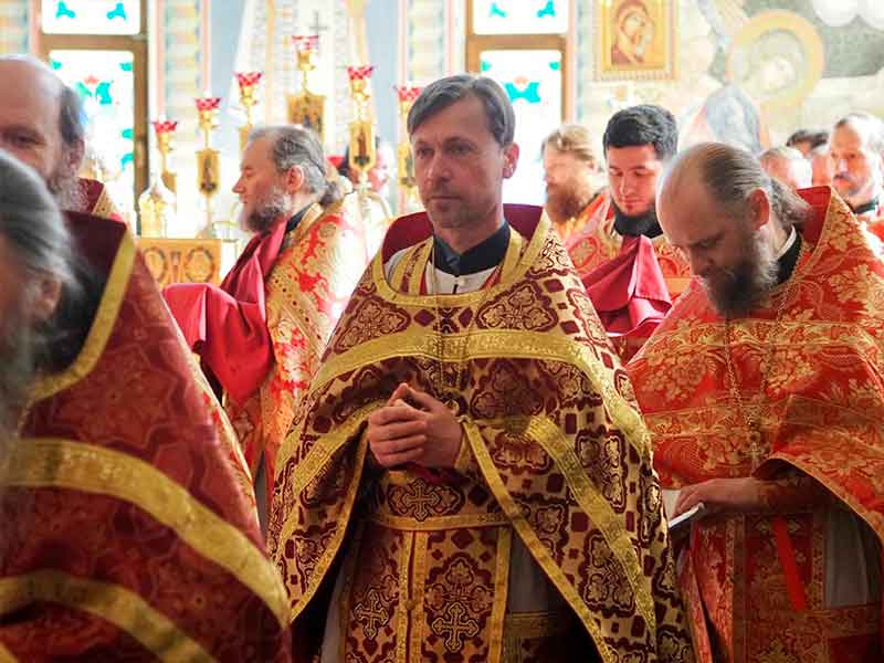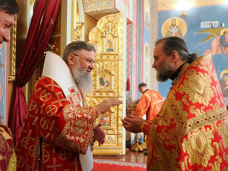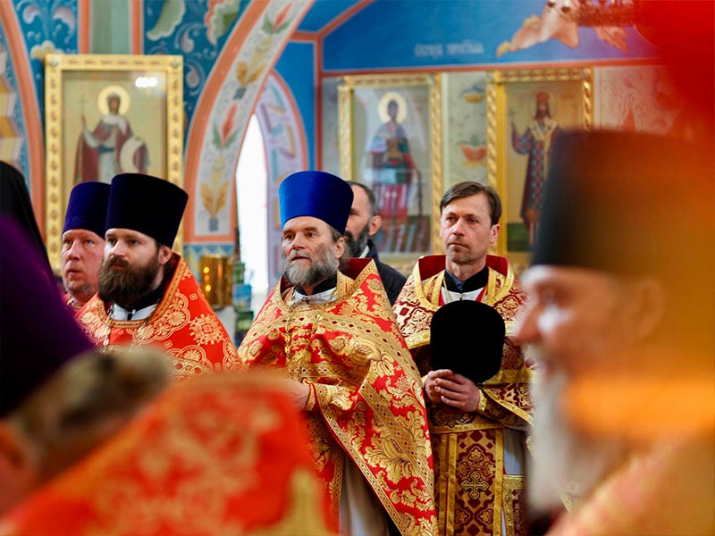 Его Высокопреосвященству сослужили:секретарь епархии, настоятель Воскресенского собора г. Южно-Сахалинска иеромонах Аполлинарий (Обухов);благочинный Южно-Сахалинского городского округа, настоятель Никольского храма г. Южно-Сахалинска протоиерей Павел Алексеев;благочинный Охинского округа, настоятель Сергиевского храма г. Охи протоиерей Георгий Журавель;благочинный Холмского округа, настоятель Никольского храма г. Холмска протоиерей Виктор Крылов;благочинный Долинского округа, настоятель Успенского храма г. Долинска протоиерей Вячеслав Каличава;благочинный Монастырского округа, наместник Покровского монастыря г. Корсакова игумен Алексий (Андреев),благочинный Курильского округа, настоятель Свято-Троицкого храма Юно-Курильска иеромонах Нестор (Елькин),благочинный Углегорского округа, настоятель Иоанновского храма г. Углегорска иерей Евгений Калашников,ключарь Воскресенского кафедрального собора г. Южно-Сахалинска иерей Владислав Ивлютини сонм духовенства Сахалинской епархии.