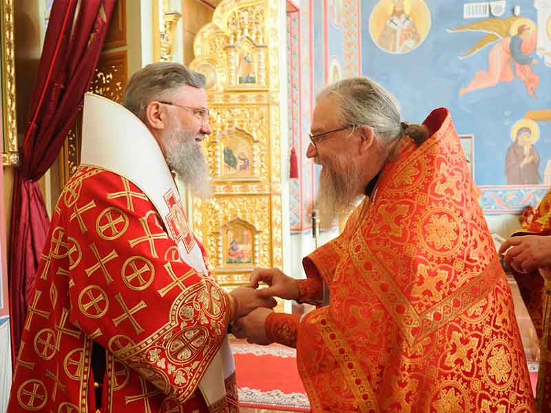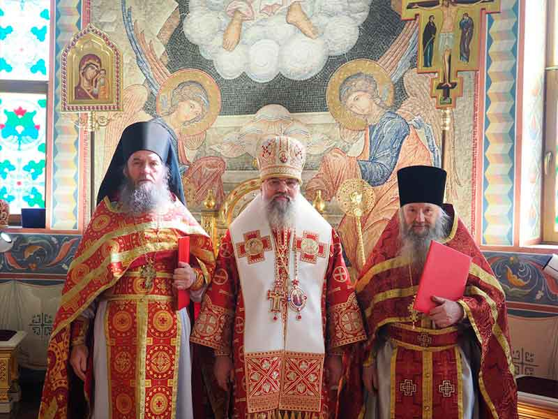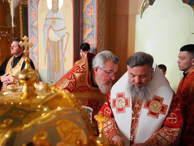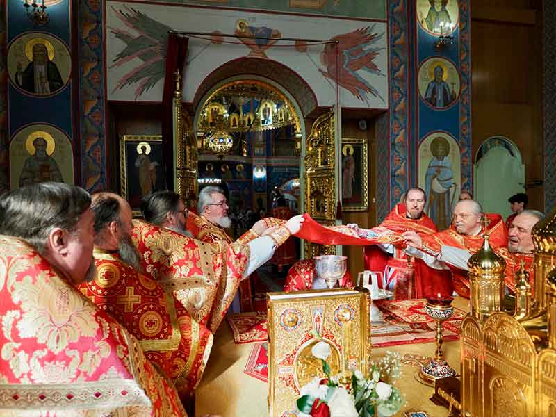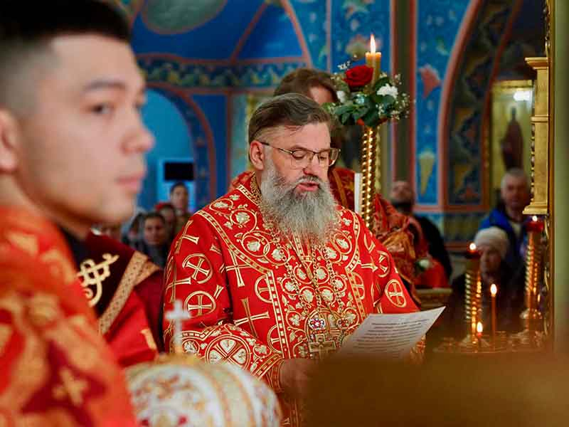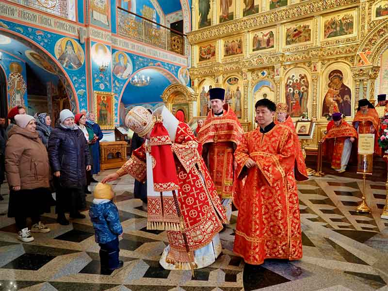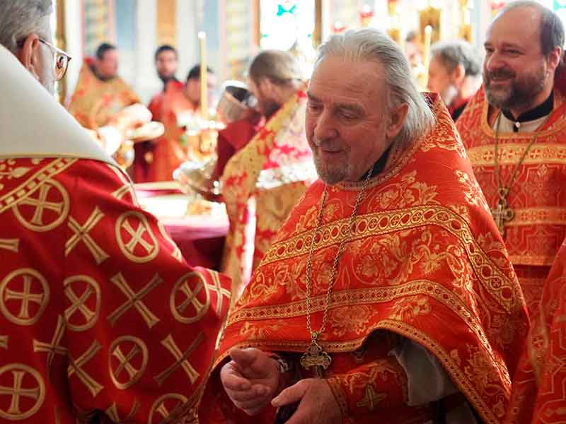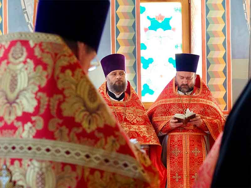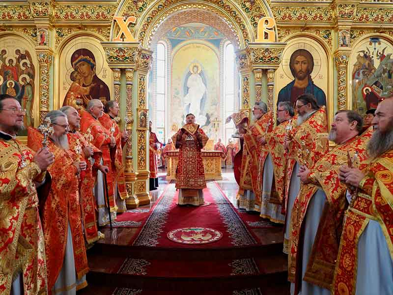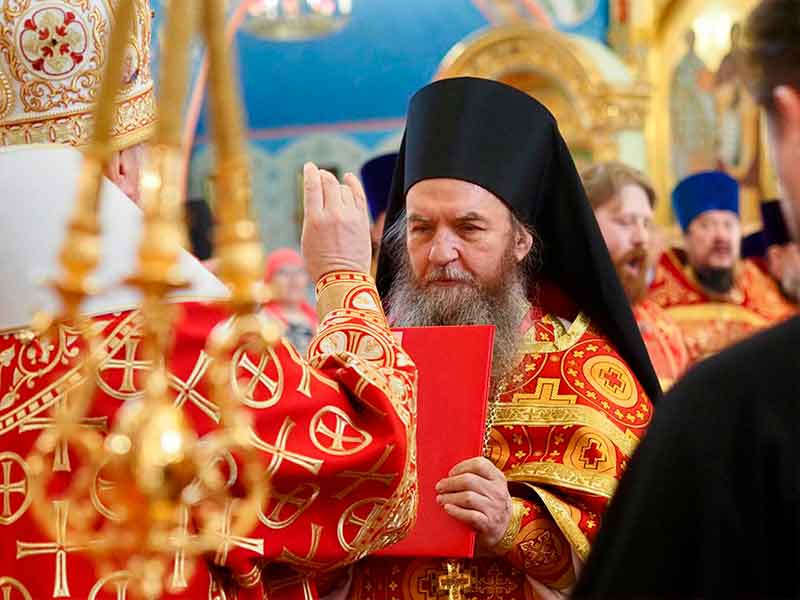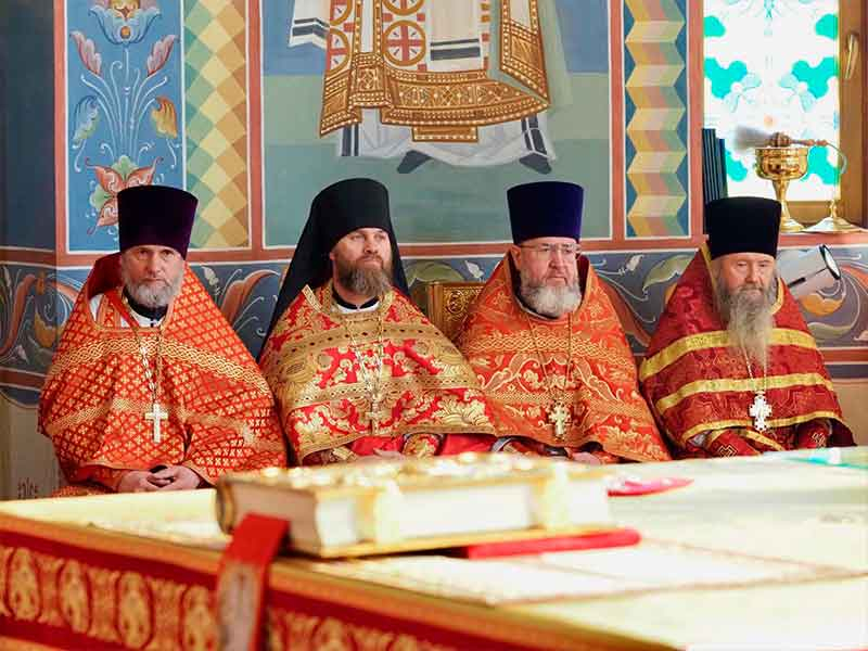 Его Высокопреосвященству сослужили:секретарь епархии, настоятель Воскресенского собора г. Южно-Сахалинска иеромонах Аполлинарий (Обухов);благочинный Южно-Сахалинского городского округа, настоятель Никольского храма г. Южно-Сахалинска протоиерей Павел Алексеев;благочинный Охинского округа, настоятель Сергиевского храма г. Охи протоиерей Георгий Журавель;благочинный Холмского округа, настоятель Никольского храма г. Холмска протоиерей Виктор Крылов;благочинный Долинского округа, настоятель Успенского храма г. Долинска протоиерей Вячеслав Каличава;благочинный Монастырского округа, наместник Покровского монастыря г. Корсакова игумен Алексий (Андреев),благочинный Курильского округа, настоятель Свято-Троицкого храма Юно-Курильска иеромонах Нестор (Елькин),благочинный Углегорского округа, настоятель Иоанновского храма г. Углегорска иерей Евгений Калашников,ключарь Воскресенского кафедрального собора г. Южно-Сахалинска иерей Владислав Ивлютини сонм духовенства Сахалинской епархии.