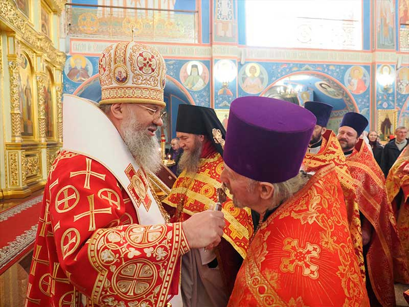 На малом входе по благословению Святейшего Патриарха Московского и всея Руси Кирилла клирики епархии были награждены богослужебно-иерархическими наградами.